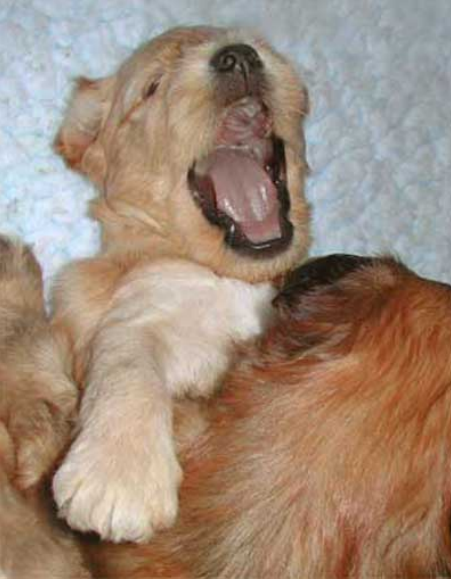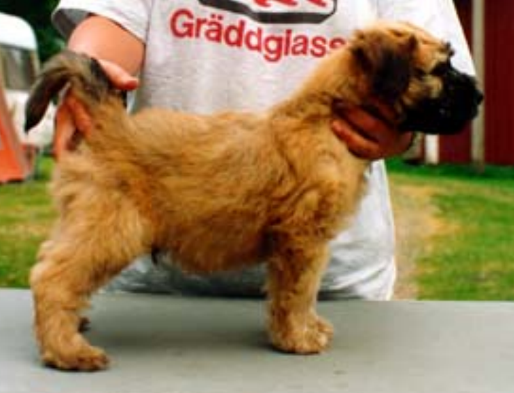 En vanlig valppäls med en hel del svarta toppar som dock ljusnar ganska snabbt och så småningom ger normal vetefärg. Denna valp bör ha Ay/- B/- Em/-